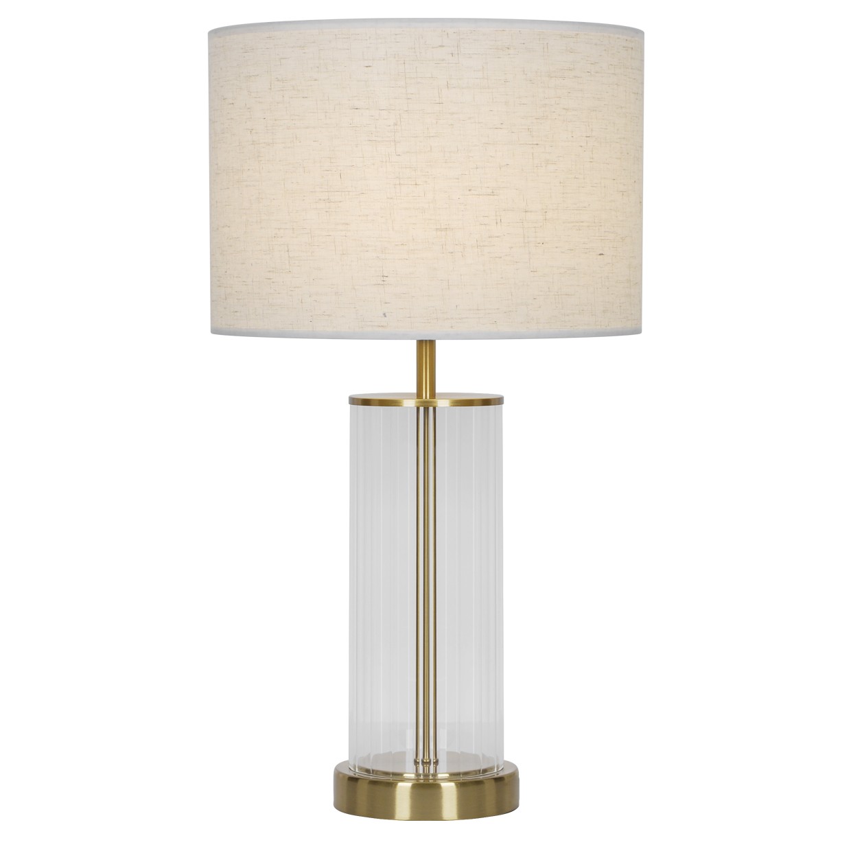 Candeeiro de Mesa com acabamento em latão, com vidro transparente na base e abatjour em tecido de linho.