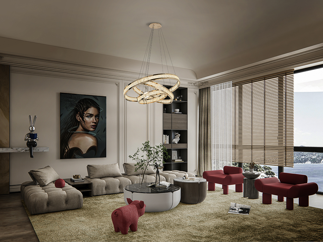 Candeeiro de três aros realizado em metal e alumínio, acabamento dourado brilho. Difusor de peças de vidro texturizado.